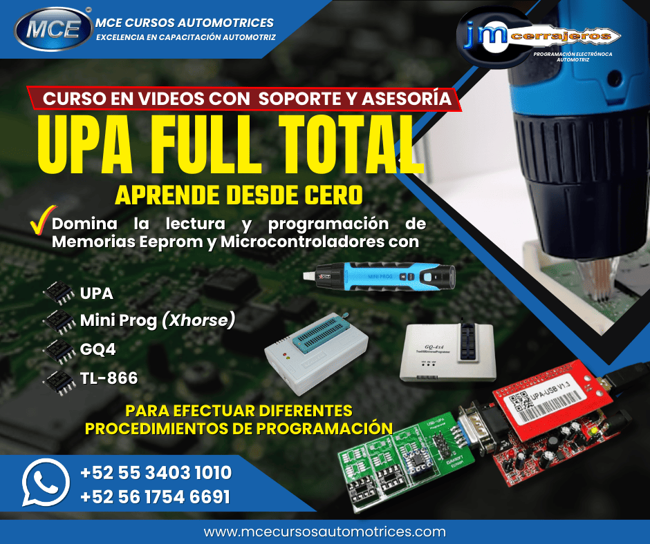 Curso UPA FULL TOTAL Aprende a Programar Memorias Eeprom y Microcontroladores de módulos inmovilizadores con UPA, Mini Prog (Xhorse), Gq4, TL866, éste curso lo puedes comprar en videos y clases grabadas guiadas totalmente explicativas. Puedes estudiar a tu ritmo, son mas de 40 horas de Formación Técnica. ¡Lo compras y lo disfrutas!